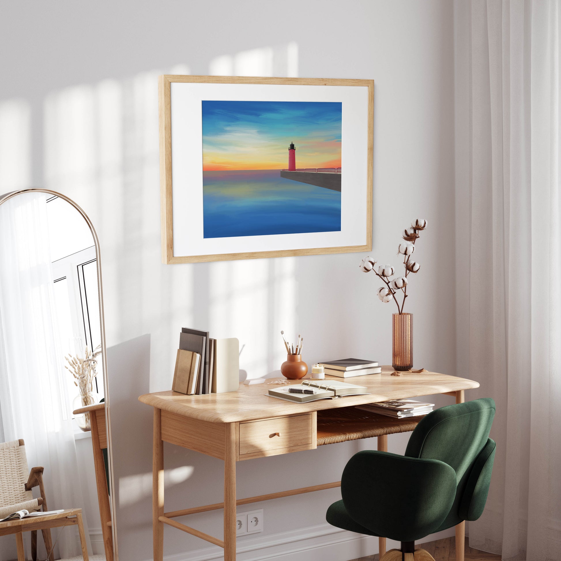 This print beautifully showcases the charm of the red lighthouse, a beloved symbol of Milwaukee, and invites a sense of calm and tranquility into any room. Perfect for those who appreciate coastal landscapes, lighthouses, or the vibrant colors of nature, this piece is an excellent addition to your home or office decor.