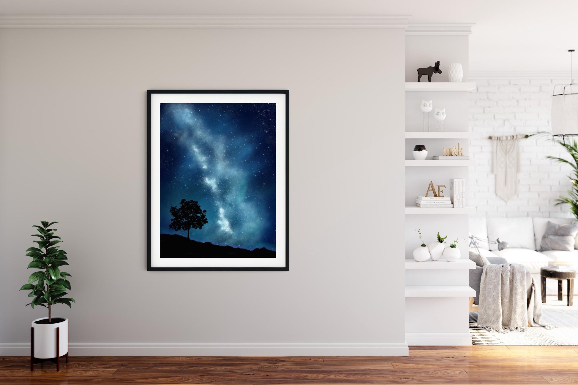 Perfect for creating a serene atmosphere in your bedroom, living room, or study, this print invites you to pause and reflect and is an ideal addition to any space where you seek a moment of solitude and inspiration. Printed on high-quality paper with rich, deep colors and sharp details, this artwork captures the serene beauty of a nighttime landscape. Its a wonderful gift for those who appreciate natures quiet moments or who simply love the calming effect of a starry night.